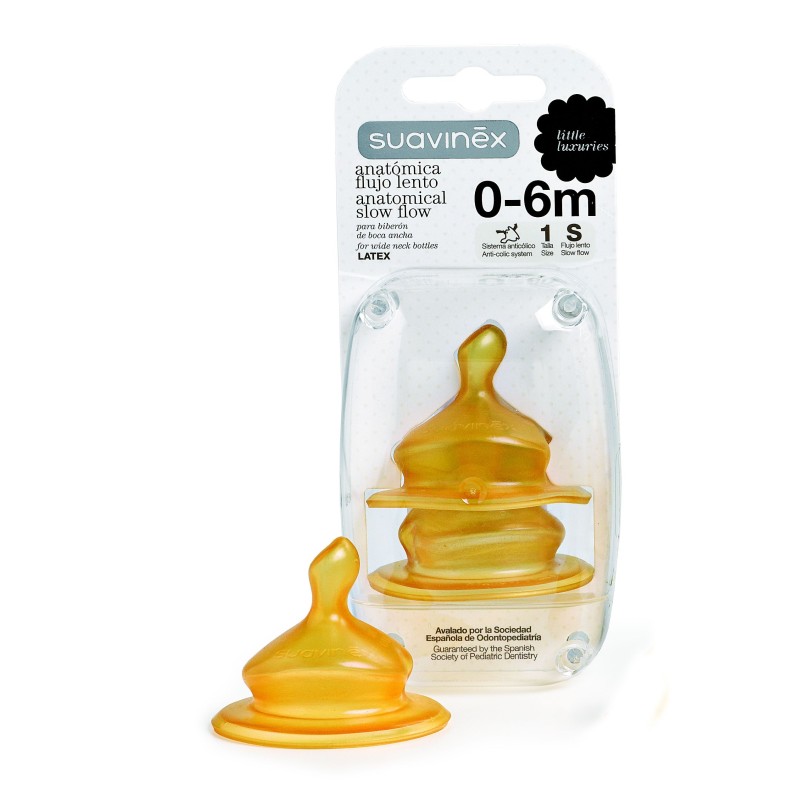La talla 1 está diseñada para bebés de 0 a 6 meses y se puede encontrar con dos tipos de flujo diferentes: flujo lento (S), ideal para los primeros días, para las tomas de glucosa, agua, etc., y flujo medio (M), para la leche, zumos y papillas muy líquidas.